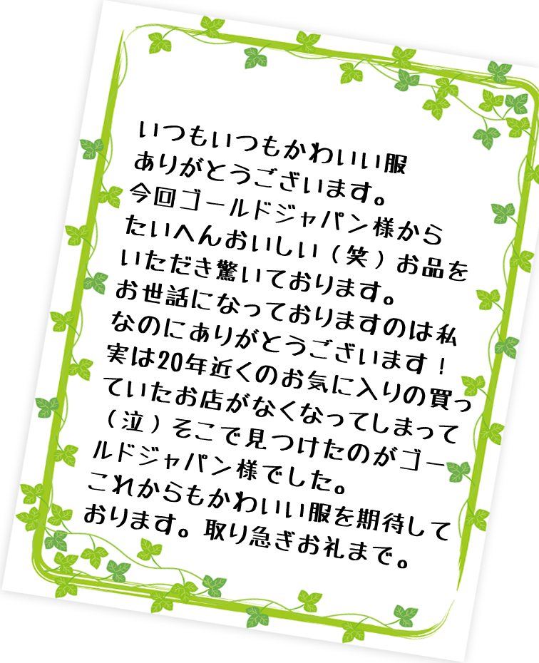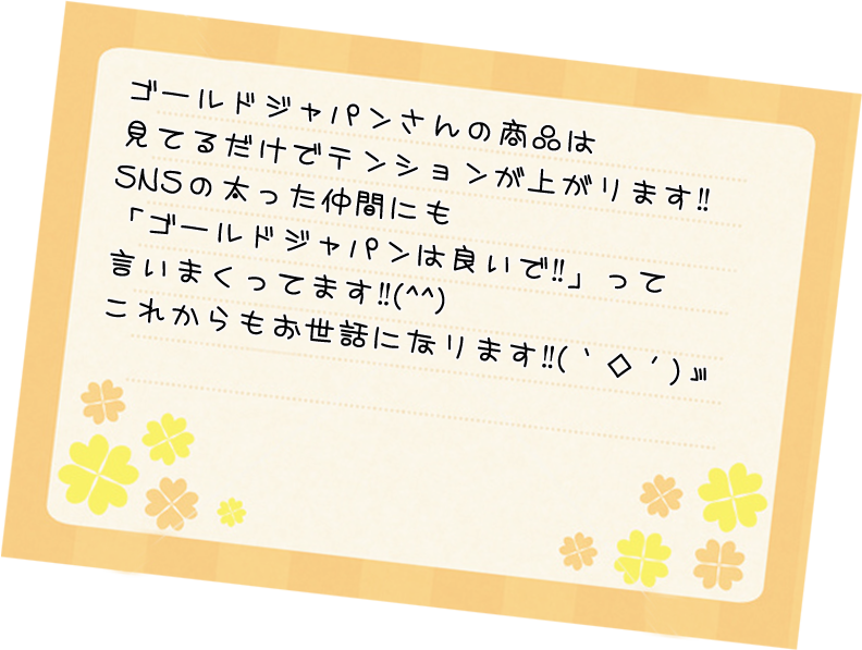 注文から到着まで気持ちの良い対応で、届いた商品も素敵だったため、すっかりゴールドジャパンのファンになってしまいました。