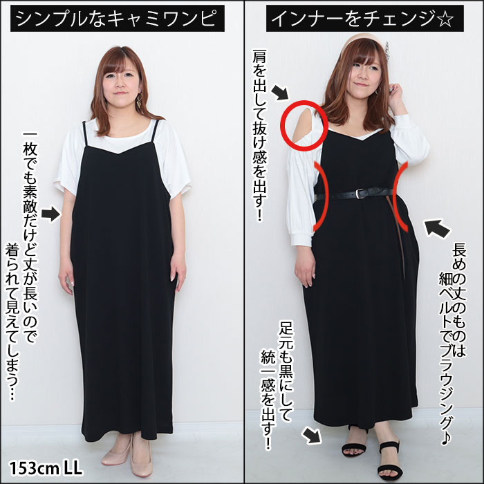 ◆キャミワンピースは丈が長めだと着られて見えがち…