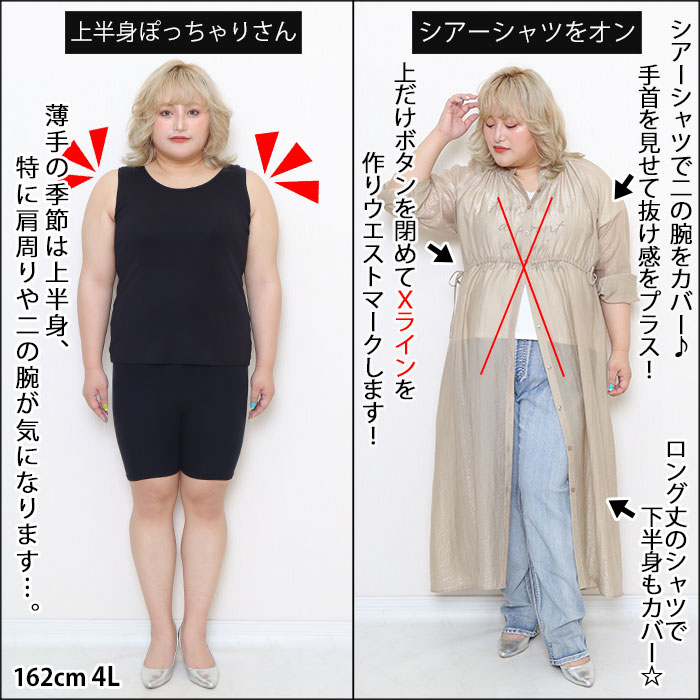 シアーシャツは上半身ぽっちゃりさんのオススメ着痩せアイテムです☆