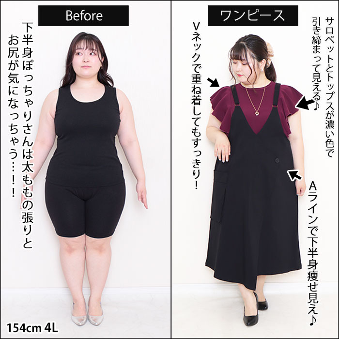 ◆サロペットワンピはVデザインをチョイスすると下半身が着痩せが叶います!