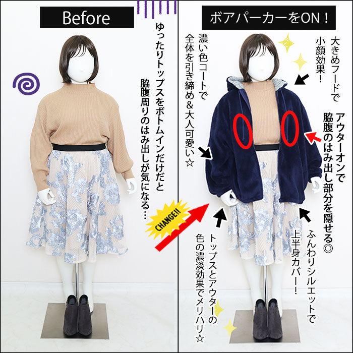 ◆アウターオンで脇腹のはみ出し部分を隠せる◎