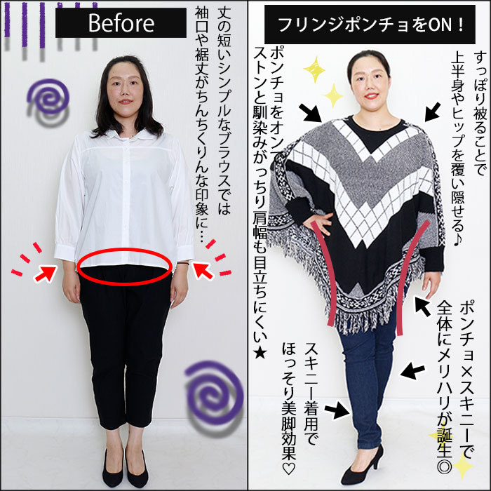 ◆ポンチョをオンで、ストンと馴染みがっちり肩幅も目立ちにくい♪