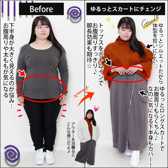 ◆ゆるっとロングスカートでお腹周り楽ちんなのに気になる下半身もカバーできちゃう!