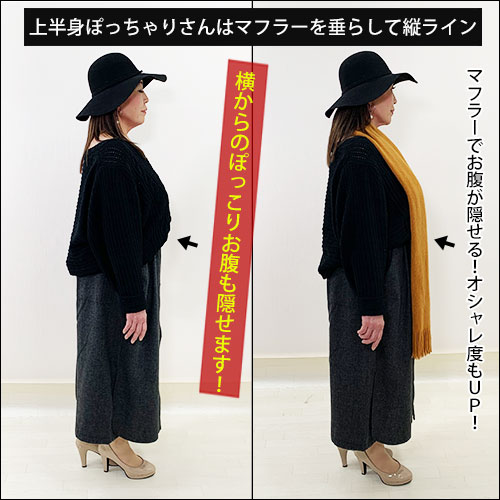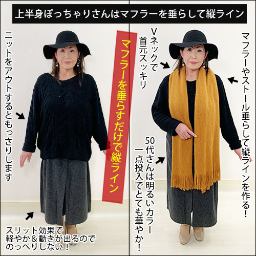 ✔︎マフラーやストールを垂らして縦ラインを作りましょう!