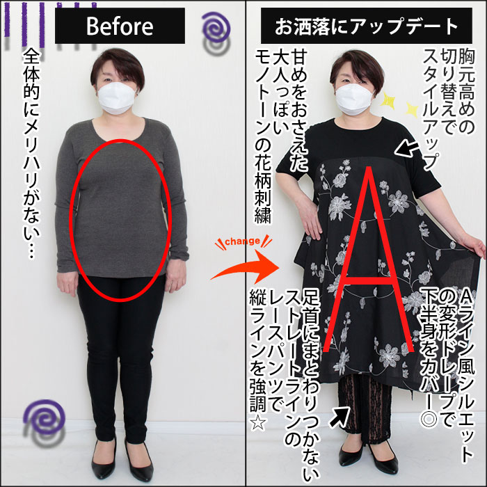 ◆Aライン風シルエットの変形ドレープで下半身をカバー◎