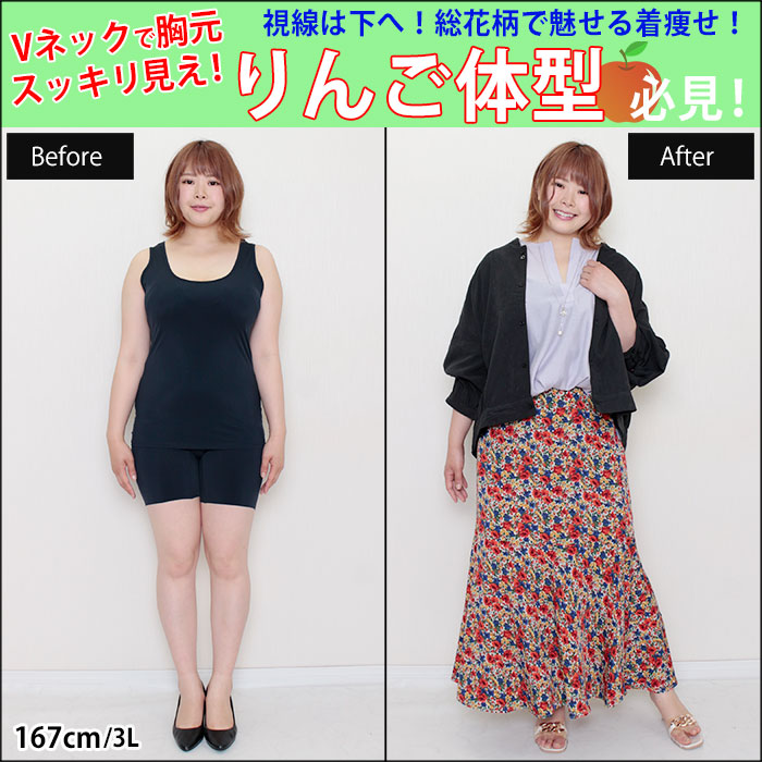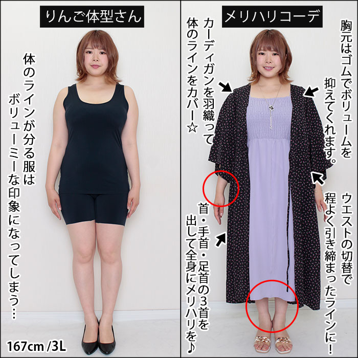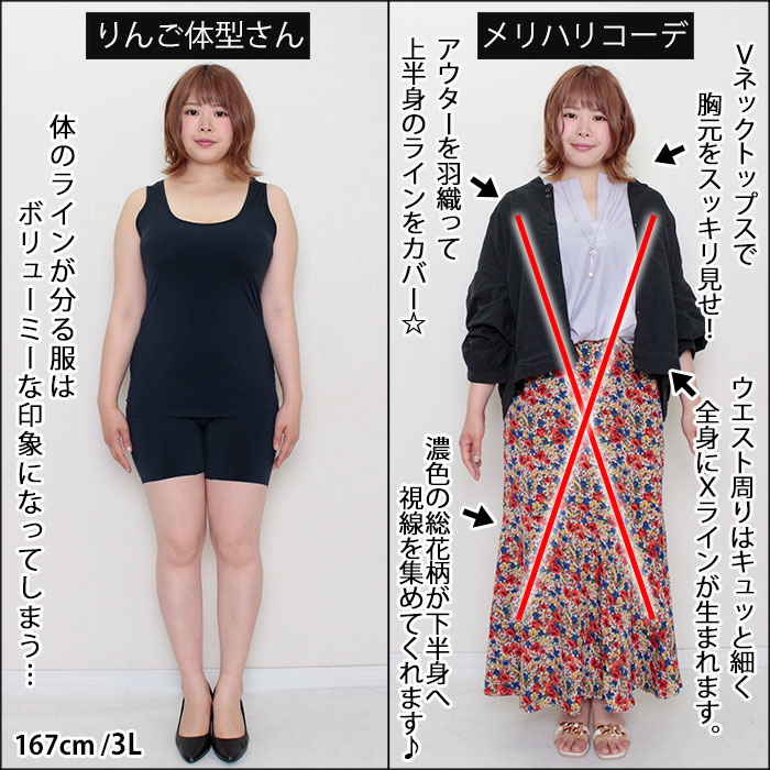 【上半身ぽっちゃりのりんご体型さん必見!細い部分をきれいに見せてメリハリ着痩せ術☆】
