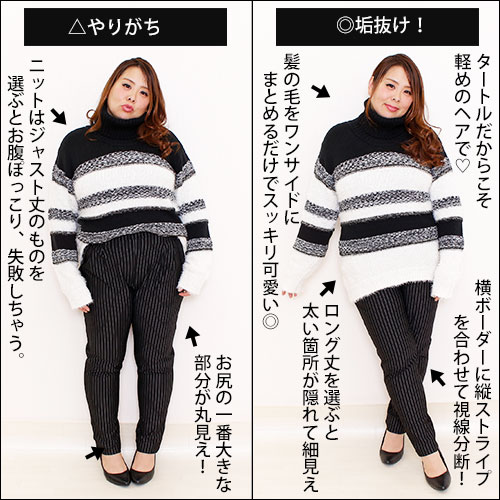 ✔︎ニットはジャスト丈で選ぶとお腹と太ももが強調されて太見え