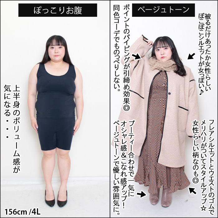 After ◆ポイントのパイピングが引締め効果◎同色コーデでものっぺりしない。 ◆被るだけであったか女性らしいぽこぽこシルエットが女っぽい♪ ◆フレアシルエットとウエストのゴムでメリハリがついてスタイルアップ☆女性らしい柄なのも◎ ◆ブーティー合わせで一気にオシャレ感&こなれ感アップ!ベージュトーンで優しい雰囲気に。