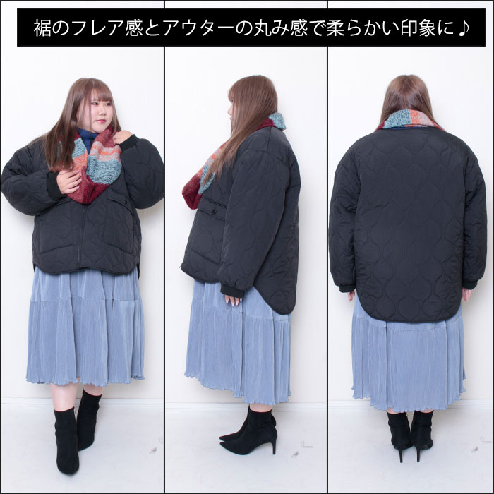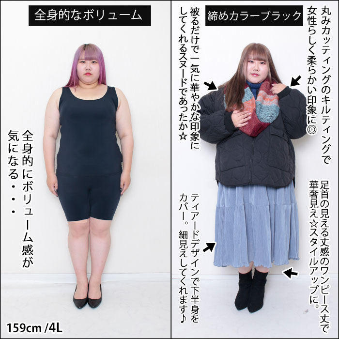 After ◆被るだけで一気に華やかな印象にしてくれるスヌードであったか☆ ◆丸みカッティングのキルティングで女性らしく柔らかい印象に◎ ◆足首の見える丈感のワンピース丈で華奢見え☆スタイルアップに。 ◆ティアードデザインで下半身をカバー。細見えしてくれます♪