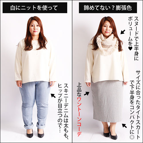 白いニットは顔周りを明るく華やかにしてくれます☆だけど太って見えそうで苦手…そんなあなたは見て下さい☆