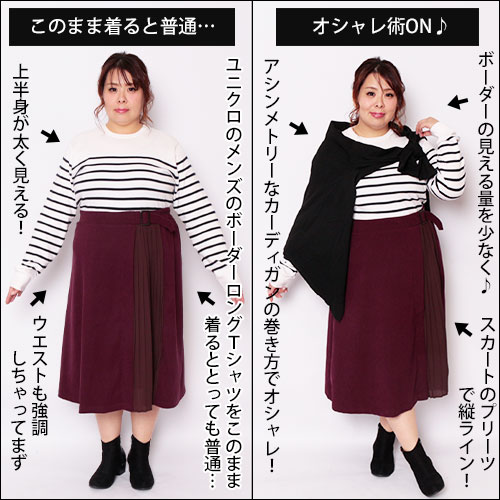 ✔︎アシンメトリーなカーディガンの巻き方テクを加えるだけで、普段着ボーダーがオシャレボーダーに変身😍❤️