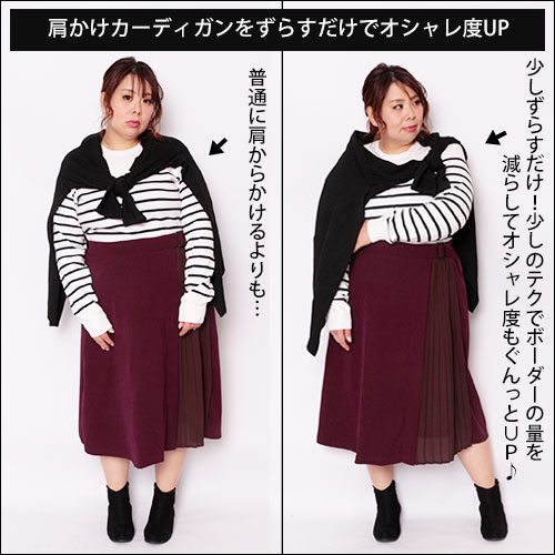 ✔︎締め色の黒カーディガンを肩からかける!そして少しずらすだけ!