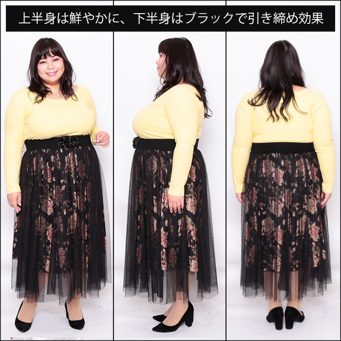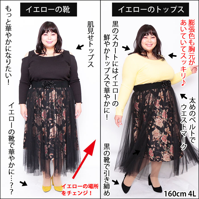 ◆視線がいく上半身を華やかに☆下半身は黒で引き締めて着痩せ♪イエローの場所を変えるだけでパッと華やかに!!