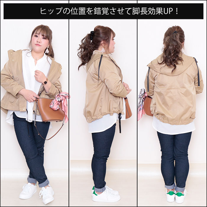 ◆マウンテンパーカーから白シャツの裾が出ている事でお尻の位置を視覚的に高く見せて脚長効果を作っています!
