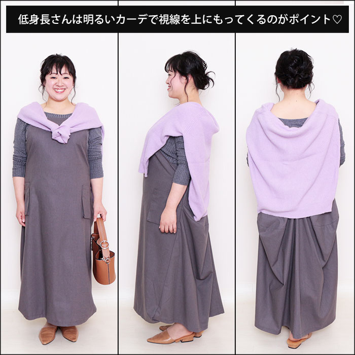 ◆下半身にボリュームが出るワンピースなので明るいカーディガンを肩掛けする事で視線を上に♪