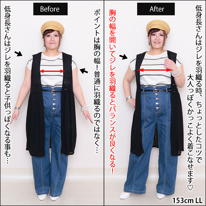 ジレを羽織るだけでこんなにスッキリ見えますよ☆是非試してみてくださいね♪