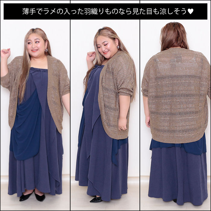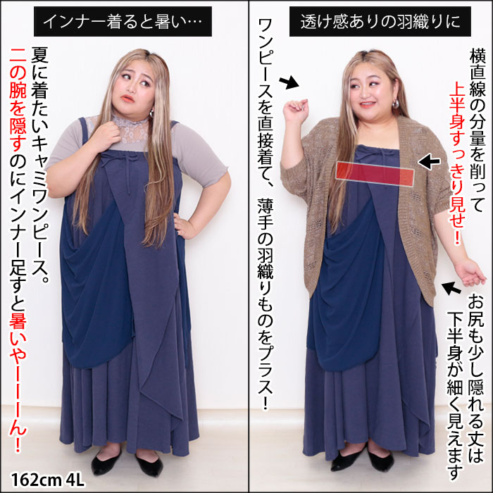 ◆キャミワンピ特有のデコルテ部分の横直線の分量を羽織りで削って上半身スッキリ♪