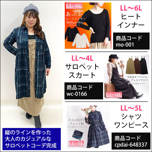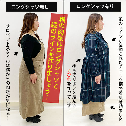 ✔︎サロペットスタイルは横からの肉感が気になっちゃう→ロングシャツを羽織る事で縦のラインを作りましょう♪