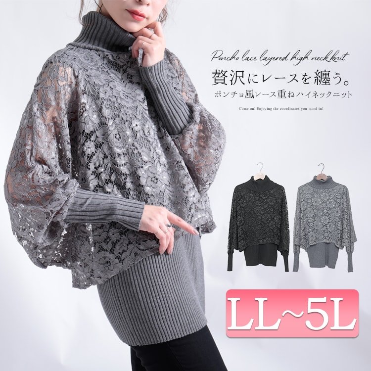 ポンチョ風レース重ねハイネックニット