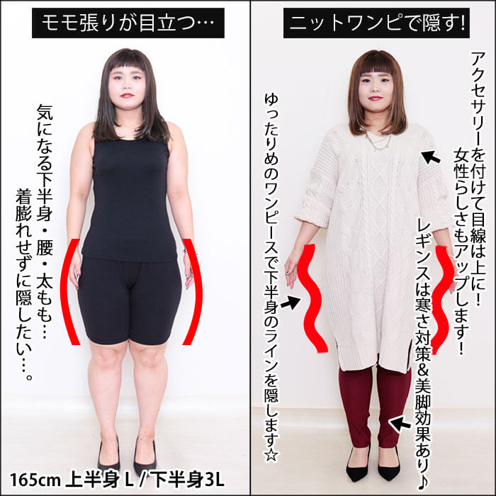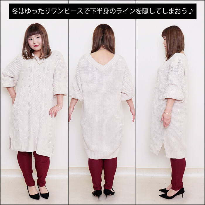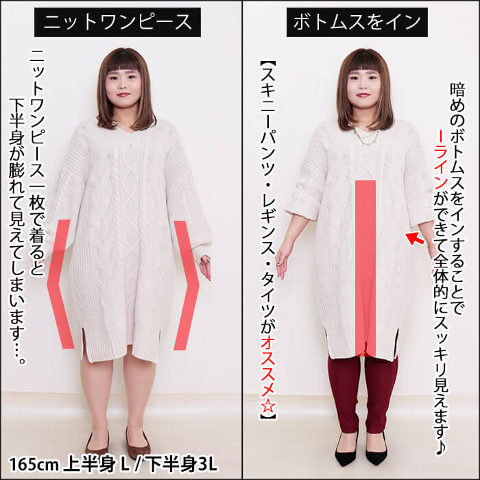 下半身ぽっちゃりさんはニットワンピース1枚で着ると下半身が膨れて見えてしまいます…。