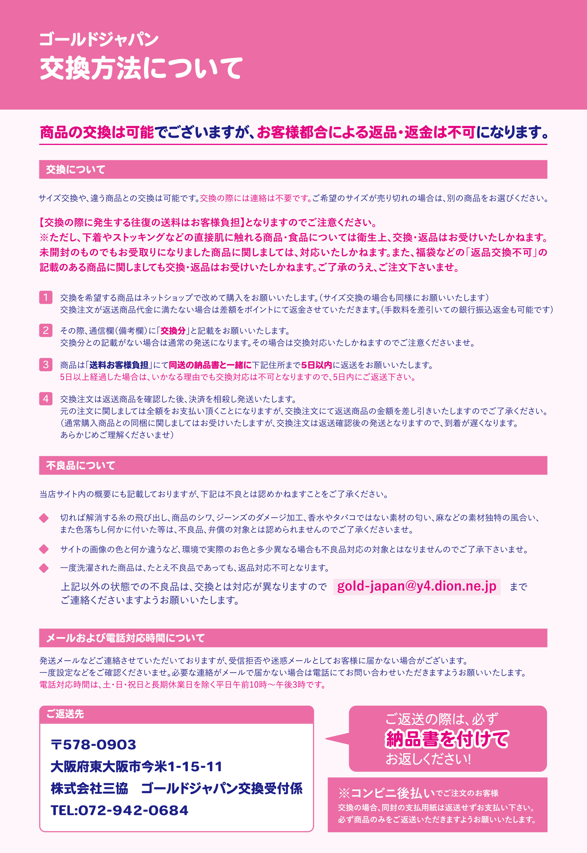 交換等の方法の詳細は、商品と同梱されたピンクの紙に記載しております。ご確認の上、お手続きください。